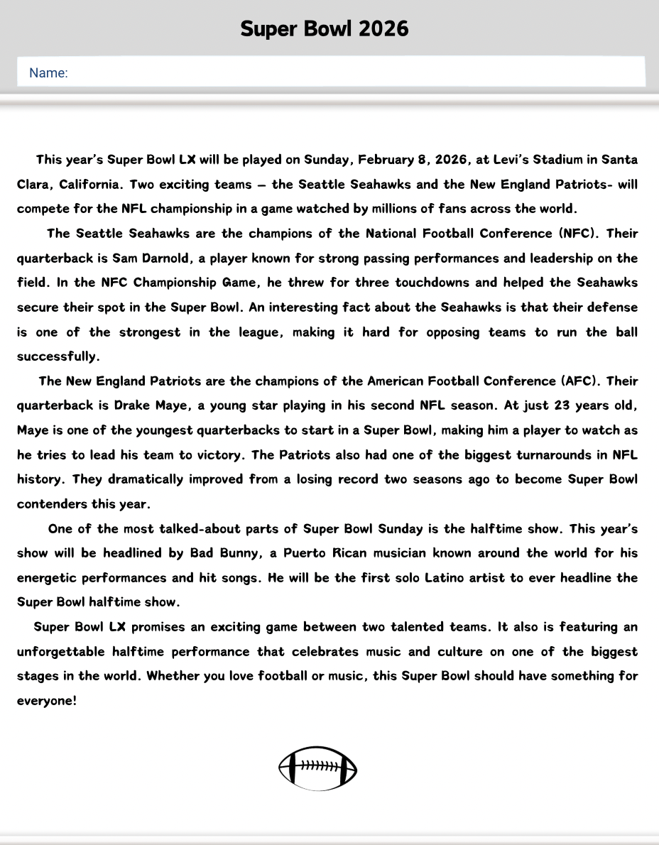 Thank you for visiting my store! Super Bowl 2026 is almost here! Here is a comprehension passage you can do with your students.
